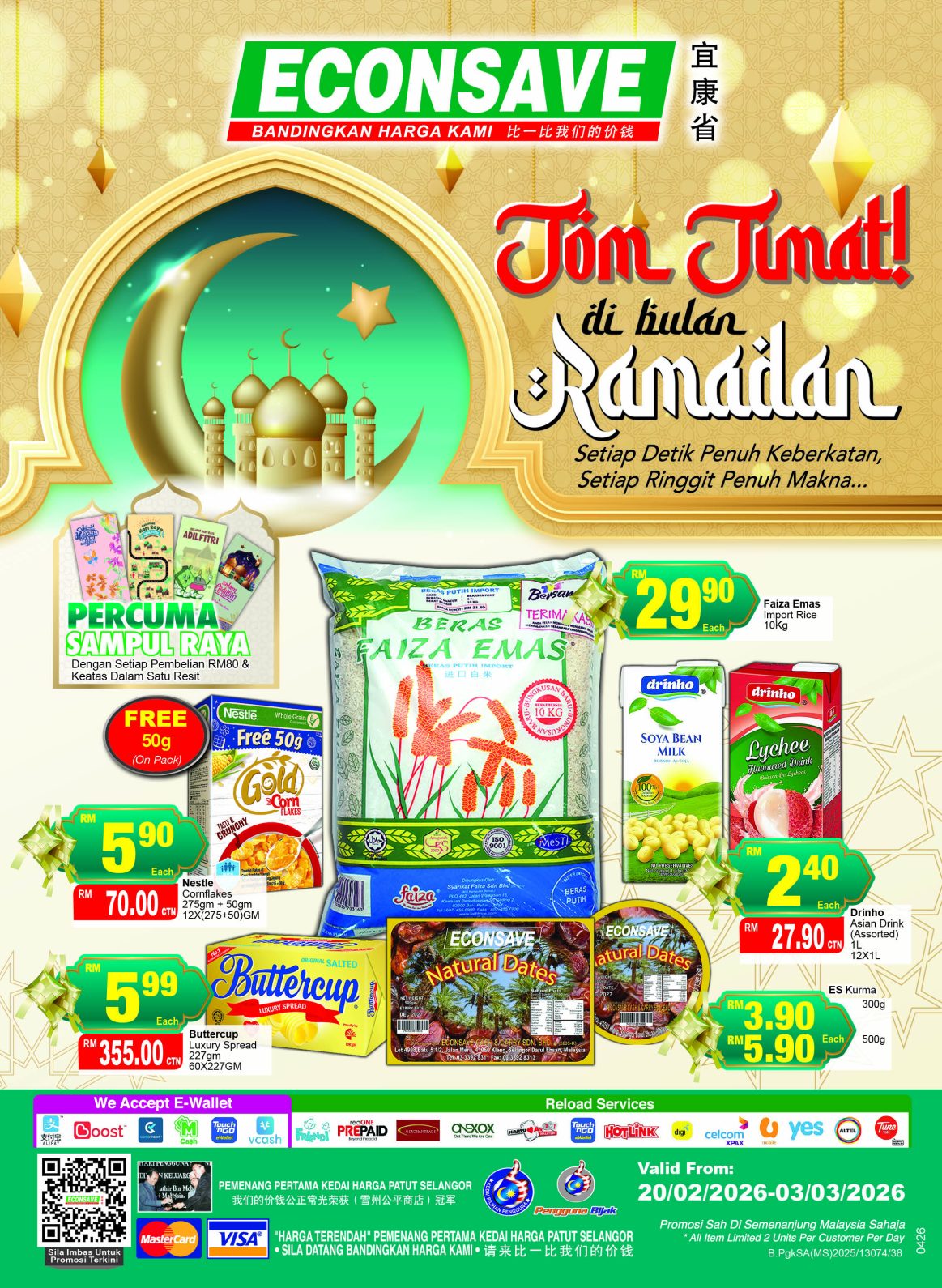 Bulan Ramadan adalah bulan penuh keberkatan, di mana setiap detik membawa makna dan setiap ringgit dibelanjakan dengan bijak. Econsave sentiasa komited menawarkan pelbagai barangan keperluan harian pada harga lebih rendah, membantu keluarga membuat persiapan sahur dan berbuka dengan tenang.