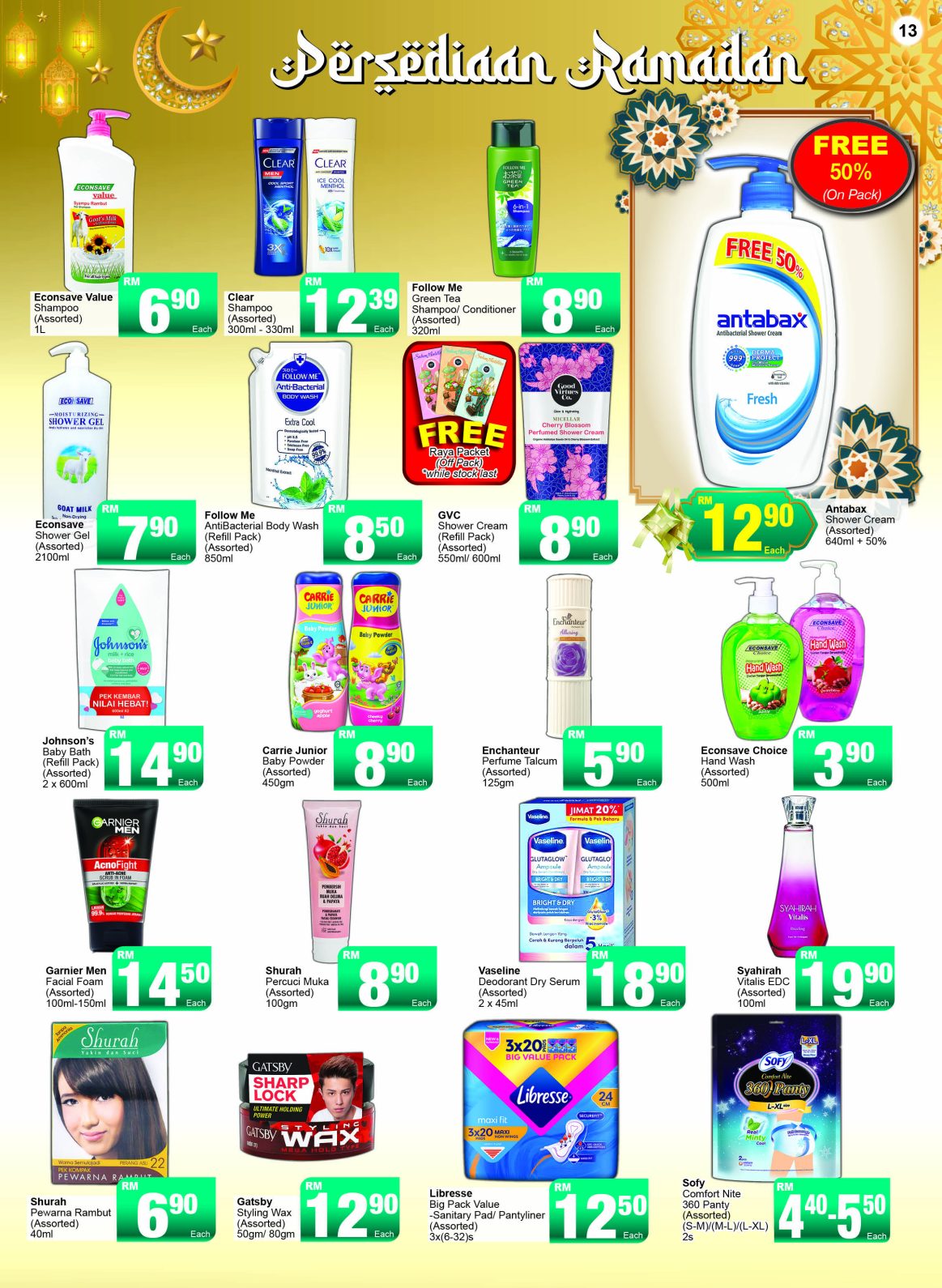 Econsave Value Shampoo 1 liter boleh didapati pada harga serendah RM6.90, manakala Clear Shampoo 300ml hingga 330ml ditawarkan pada harga yang berpatutan iaitu RM12.39 setiap satu. Antabax Shower Cream 640ml + 50% pula tersedia pada harga serendah RM12.90, manakala GVC Shower Cream refill pack dijual pada harga serendah RM8.90.