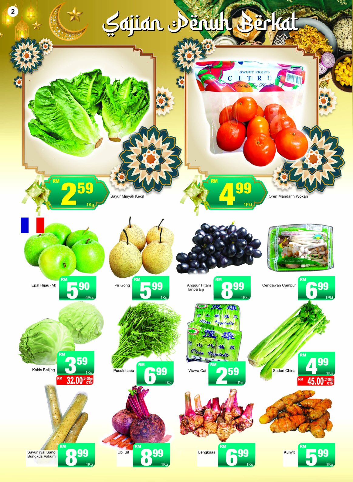 Sayur minyak kecil dijual pada harga serendah RM2.59 sekilogram, sesuai untuk hidangan tumis yang ringkas. Kobis Beijing pula boleh didapati pada harga serendah RM3.59 sekilogram, manakala pucuk labu ditawarkan pada harga serendah RM6.99 sekilogram, sesuai untuk masakan lemak atau sup. Wawa cai juga tersedia pada harga serendah RM2.59 sebungkus, manakala saderi China boleh diperoleh pada harga serendah RM4.99 sekilogram.