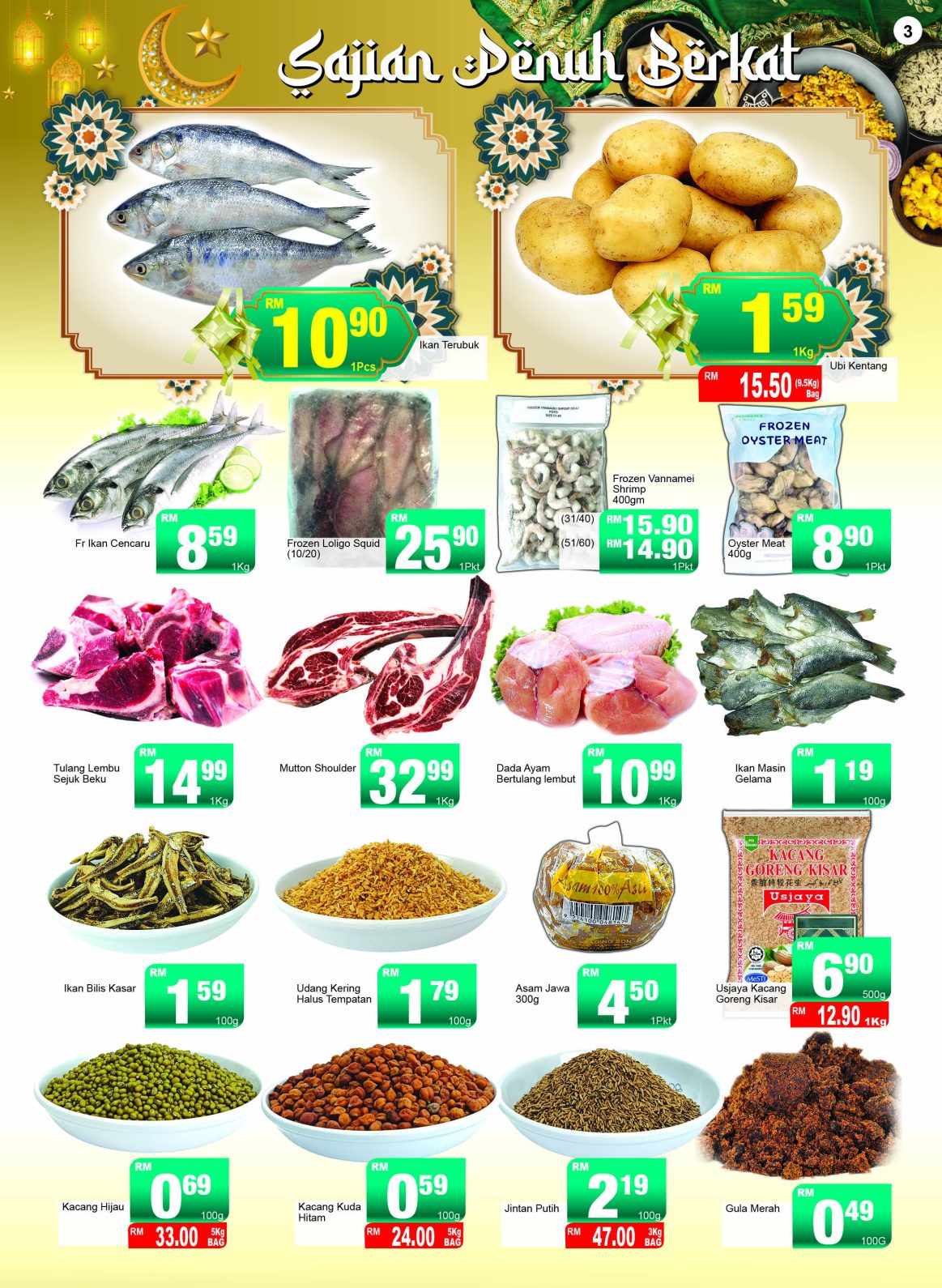 Untuk hidangan berasaskan daging, tulang lembu sejuk beku boleh diperoleh pada harga serendah RM14.99 sekilogram, manakala mutton shoulder dijual pada harga serendah RM32.99 sekilogram. Dada ayam tanpa tulang lembut pula tersedia pada harga serendah RM10.99 sekilogram. Pelengkap rasa seperti ikan masin gelama pada harga serendah RM1.19 setiap 100g, ikan bilis kasar pada harga serendah RM1.59 setiap 100g serta asam jawa 300g pada harga serendah RM4.50 sebungkus turut membantu menyempurnakan masakan tradisi keluarga.